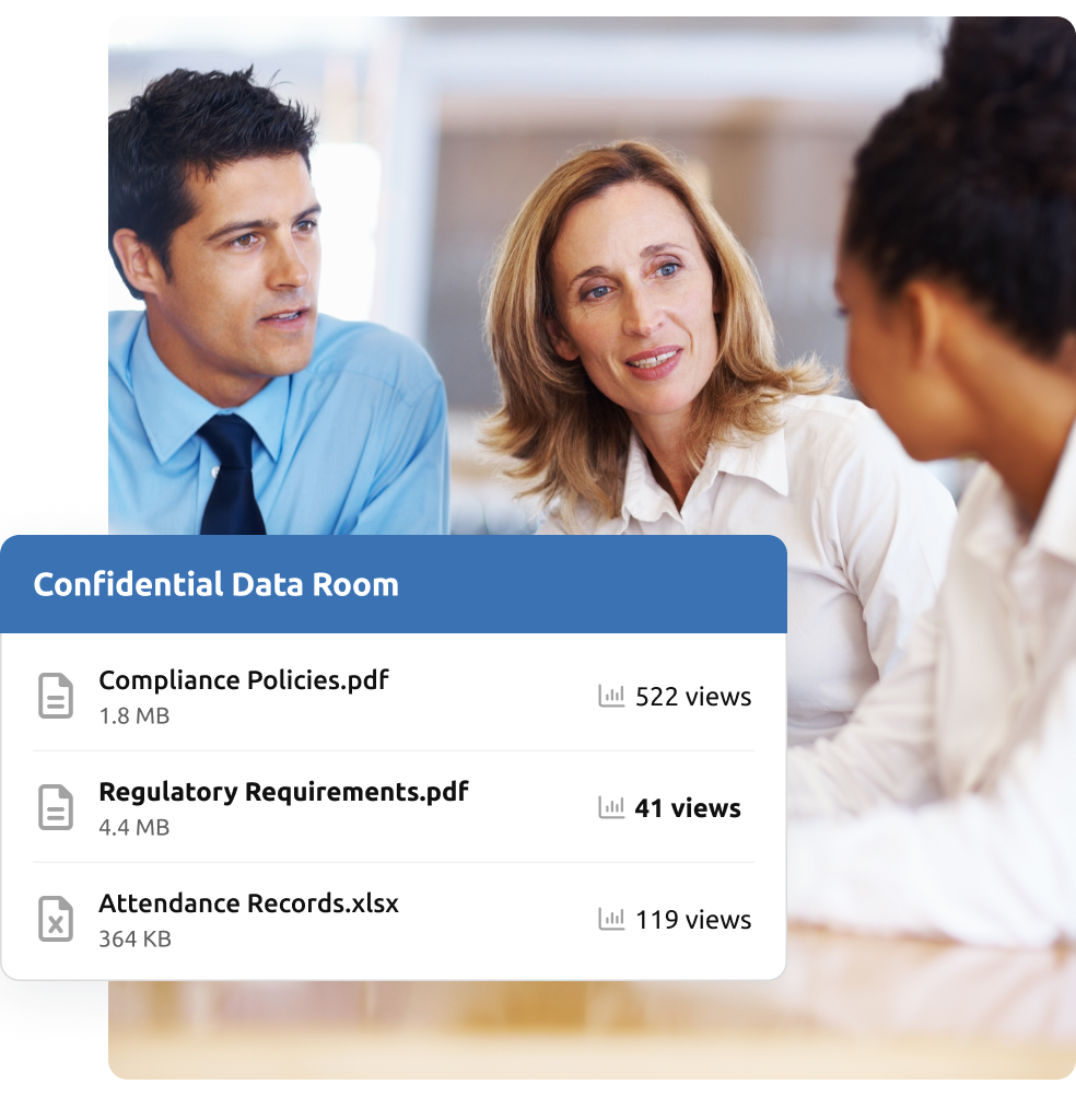 Collaborate confidently with internal teams, auditors, and regulators. Centralize compliance documents in secure, branded data rooms and ensure stakeholders always work from the latest approved version. One platform – total control.