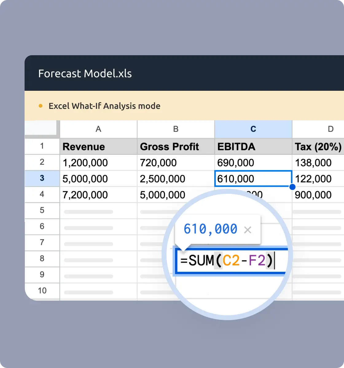 Excel What-If Analysis lets data room guests view, edit, and test spreadsheet scenarios one cell at a time without downloading or altering the original file.