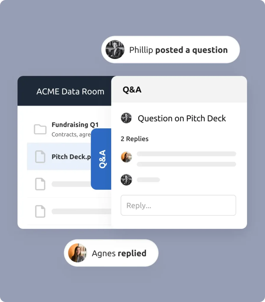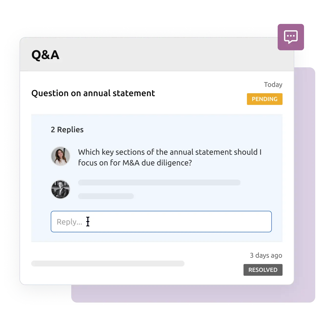 Handle complex deal discussions securely inside the data room. Keep all stakeholders aligned with contextual Q&A.